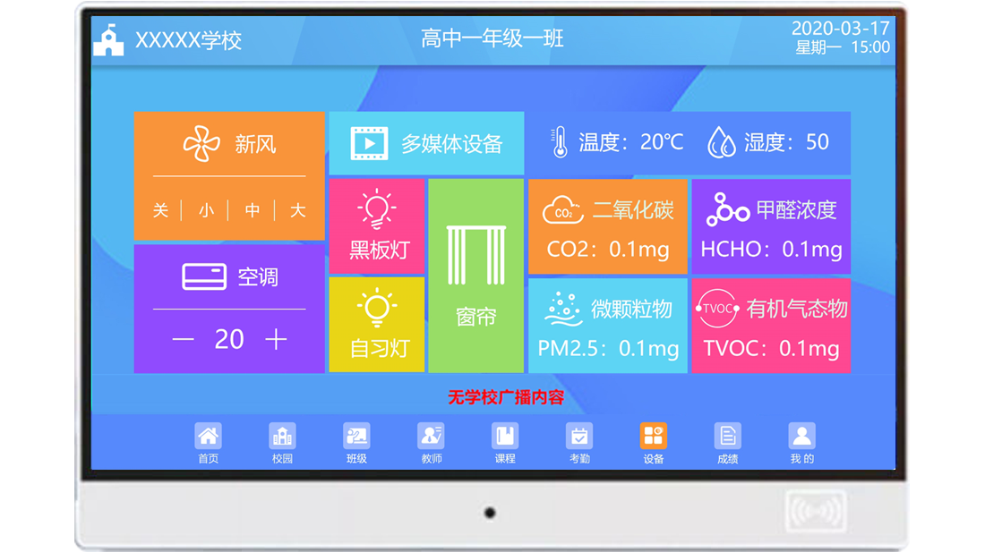 以及二氧化碳、甲醛濃度等教室設備環境進行一鍵控制,上課、自習、午休等多種場景模式,