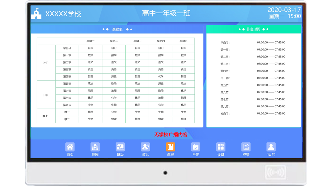 對所在班級的課程安排以及學校的作息時間的展示,讓師生合理安排時間,增強時間觀念。